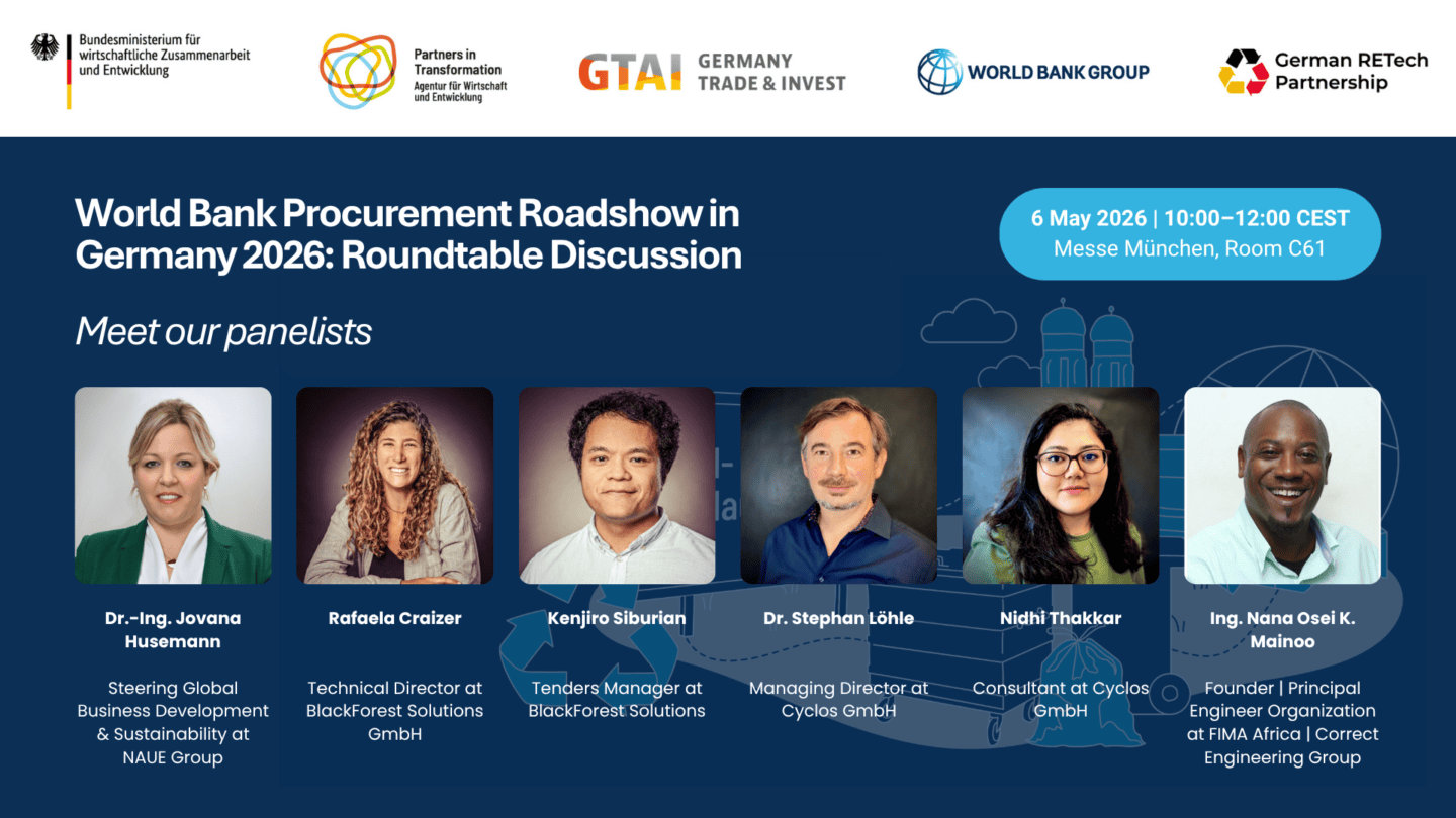 German RETech Partnership ist das Netzwerk deutscher Unternehmen und Institutionen der Entsorgungs- und Recyclingbranche für den Export bewährter Technologien und Know-how-Transfer.
